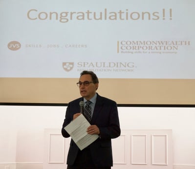 Governor Charlie Baker’s task force that examined how to address chronic unemployment in Massachusetts, which led to the creation of the Learn to Earn Initiative. He said when that task force was meeting, the state unemployment rate was around 8 percent, as opposed to the 2.5 percent rate today and subsequent tight labor market. “When we were at 8 percent, it was certainly true we want to bring everyone in, but at 2.5 percent, we not only want to bring everyone in, we have to bring everyone in,” Rubin said, adding that the unemployment rate for people with disabilities continues to be “outrageously high” compared to the overall unemployment rate. “It’s absolutely ridiculous that, in that situation, anyone who has talent and wants bring that talent to work can’t find a job and can’t give those talents to the employer, the community, and of course to themselves for their own improvement. The LTE project that we’ve been involved with and being partnered with Spaulding in trying to address this issue is a real privilege.” Anthony Britt, Commonwealth Corporation associate director of Sector Strategies, noted that a successful program and continued success for the graduates requires teamwork, which also includes the support of the trainees’ friends and family. “You have a great team behind you … Whether it’s Micah [Fleisig, JVS manager of