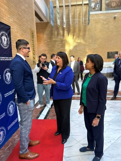 At the 2025 MassHire Awards Celebration held at the Massachusetts State House, YouthWorks participant and MassHire Holyoke intern Jacob Santos met with Lieutenant Governor Kim Driscoll and Labor and Workforce Development Secretary Lauren Jones. Santos was invited to deliver remarks about his YouthWorks experience and introduce the Lieutenant Governor.